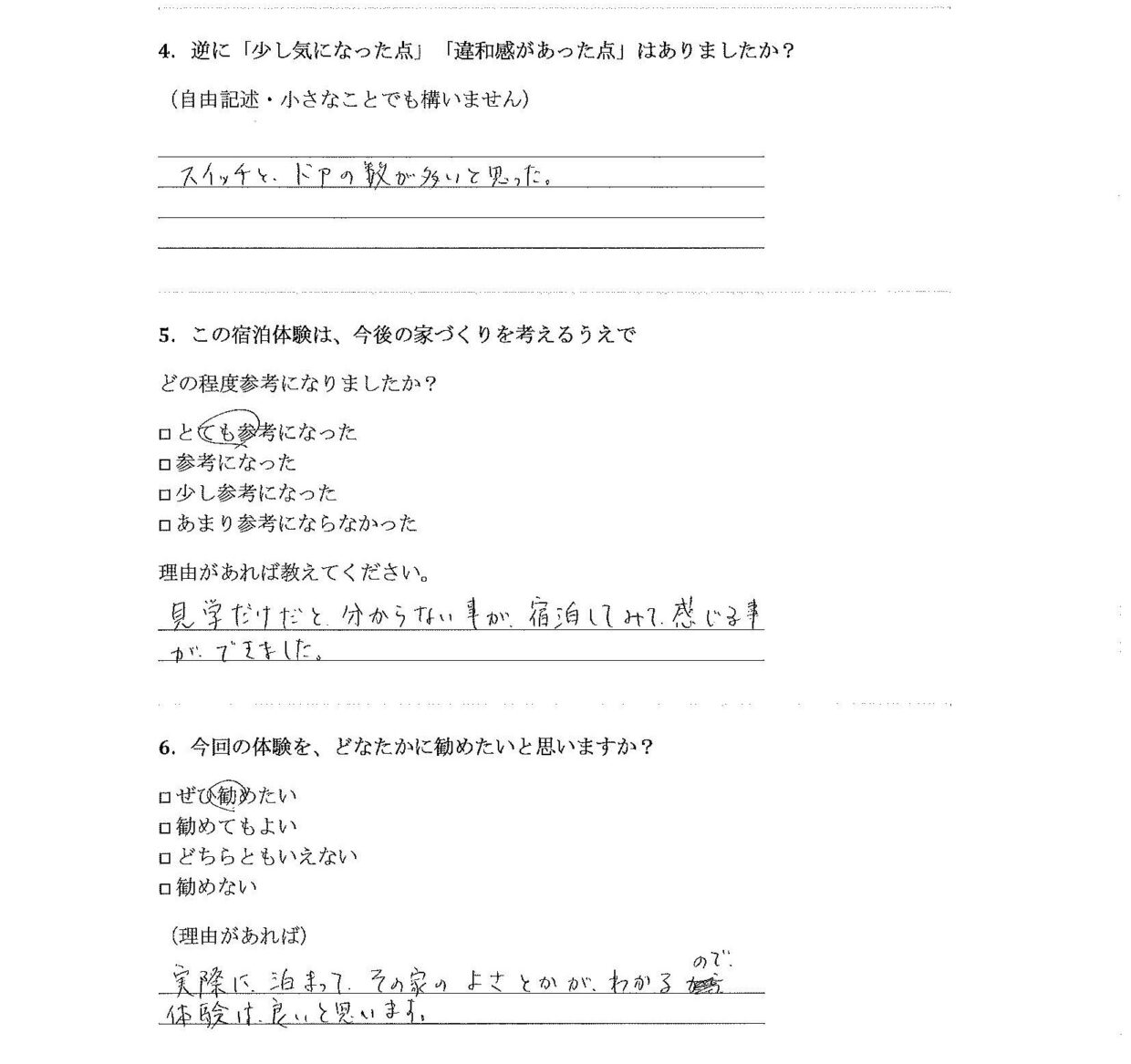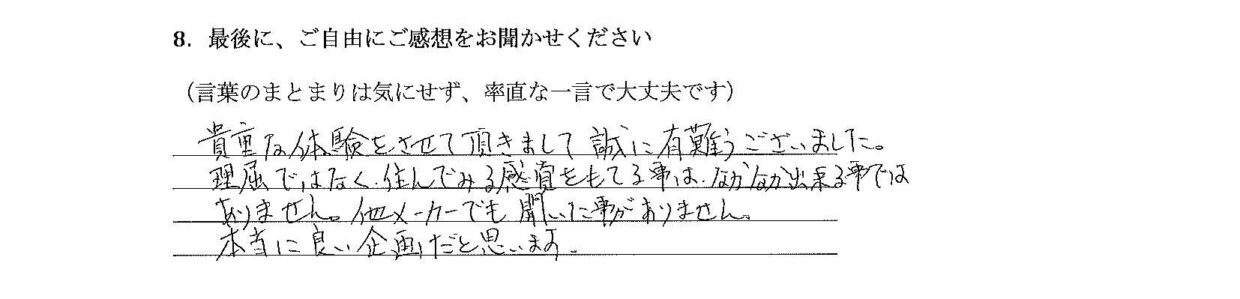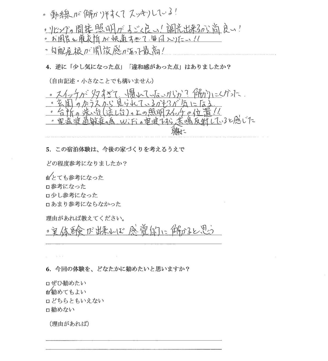 何度か見学会や2時間貸切などもご利用いただいておりますが「お風呂に入って寝ると全然違う」「住んでいるように過ごせた」と喜んで頂きました。