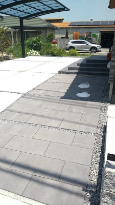 カーポートの下に土間コンを打って、玄関アプローチのタイルを敷き詰めています。