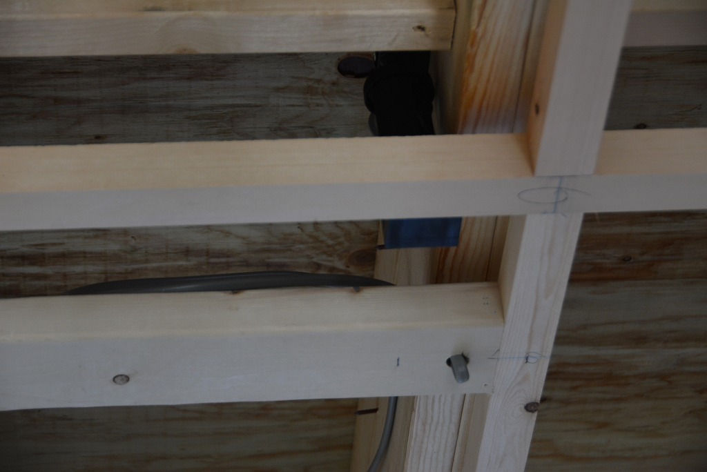 2階の床構造体と、1階天井の下地を繋ぐ「joto」製 防振吊り木が見えます。