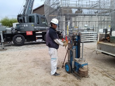 先端にドリルの付いたパイプに荷重を掛けて地中にねじ込むことで、