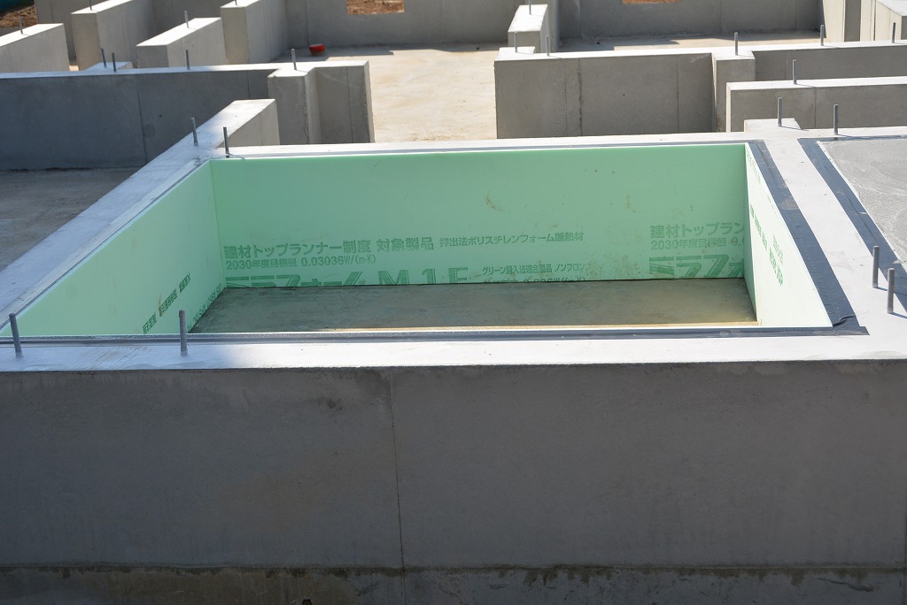 基礎の立上り面に、樹脂系断熱材の「ミラフォーム」を張り付けておきます。