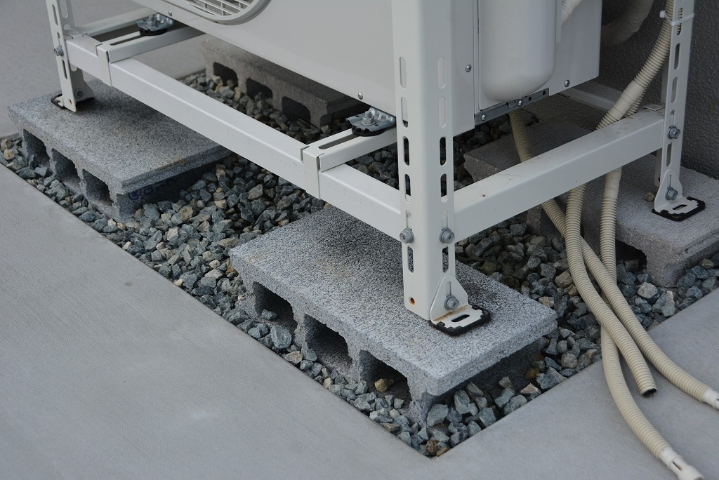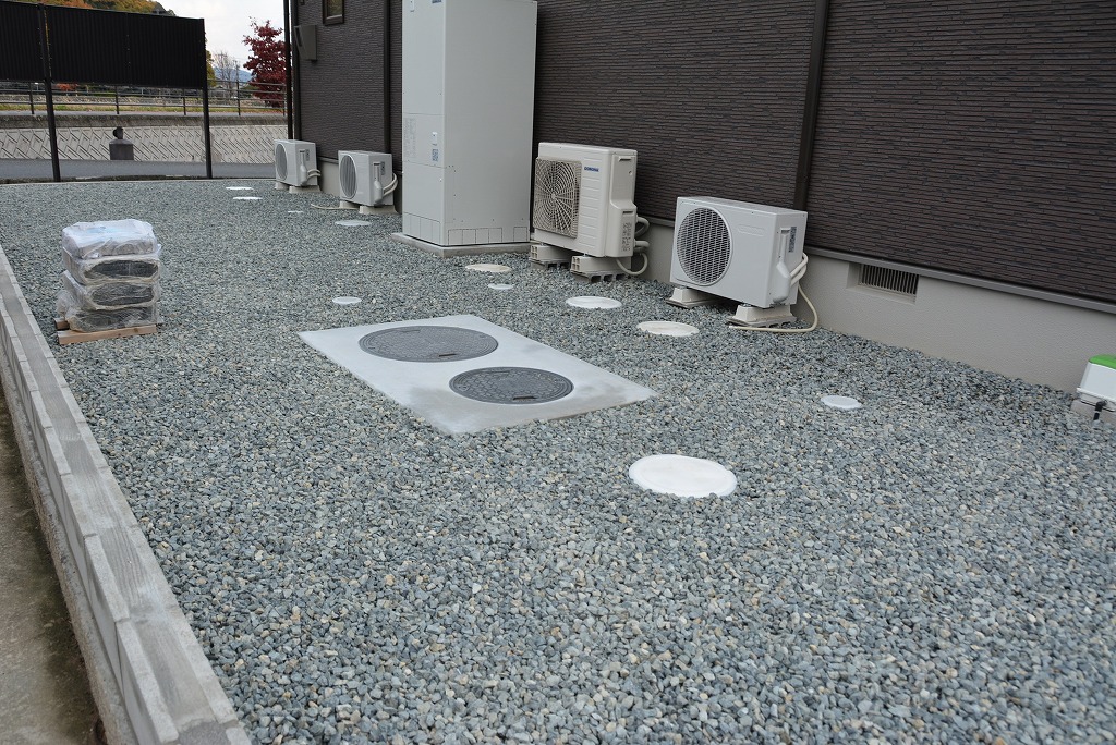 土間コン打ちが多い外構ですが、室外機周辺は、冷房時の排水の