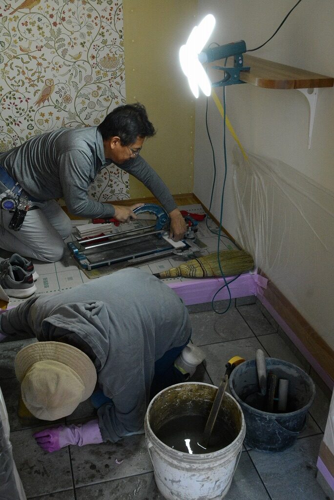 久保タイルさんが、玄関とポーチ部分のタイルを施工中です。