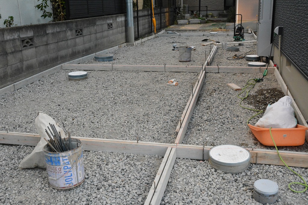 砕石を入れたら、しっかり転圧して、メッシュ筋を敷き込み