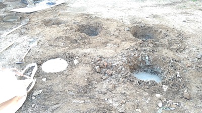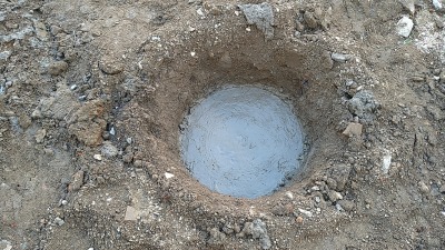 決められた場所に決められた深さまで地面を掘り進んだあと、コンクリートを流し込んでいきます。