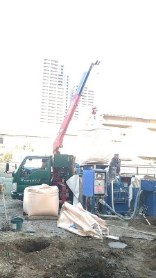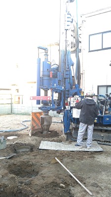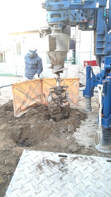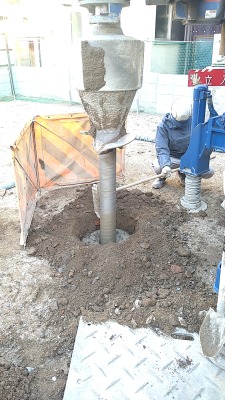 ドリル付きの機械の上下運動を繰り返すと、地中にコンクリートの柱が出来ていきます。