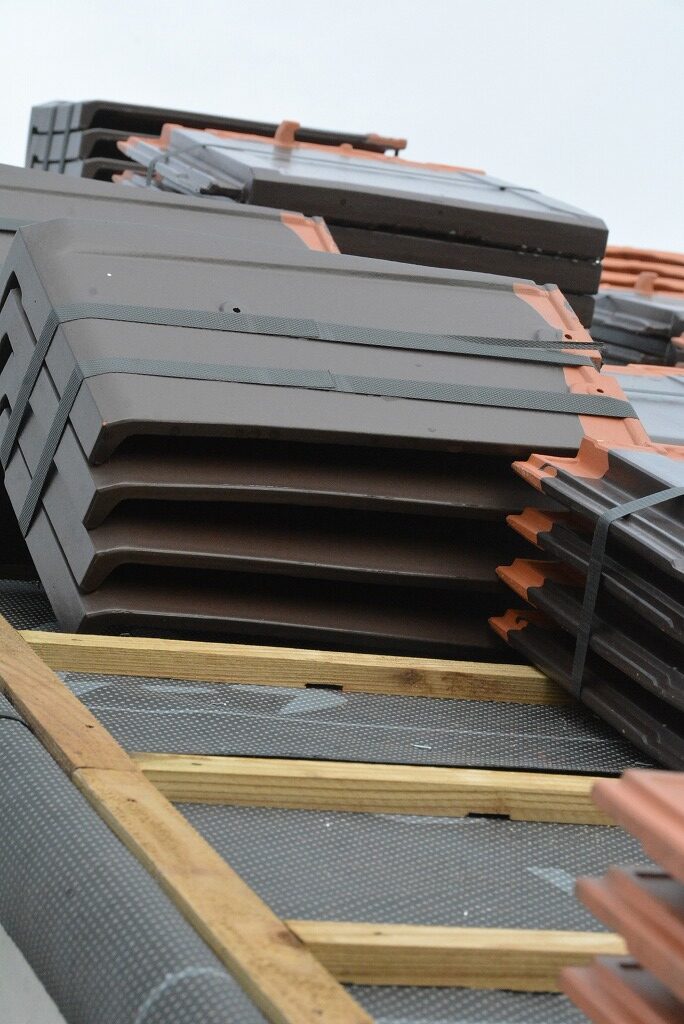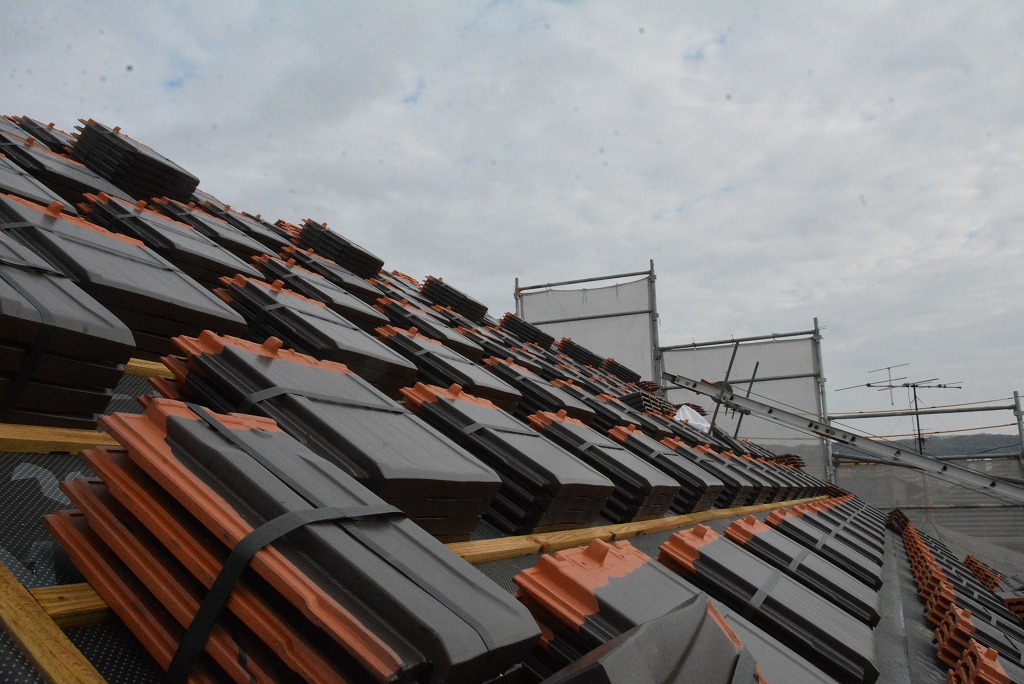 小分けした瓦の束を 屋根全体に均等に配置し、建物全体に荷重を掛けます。