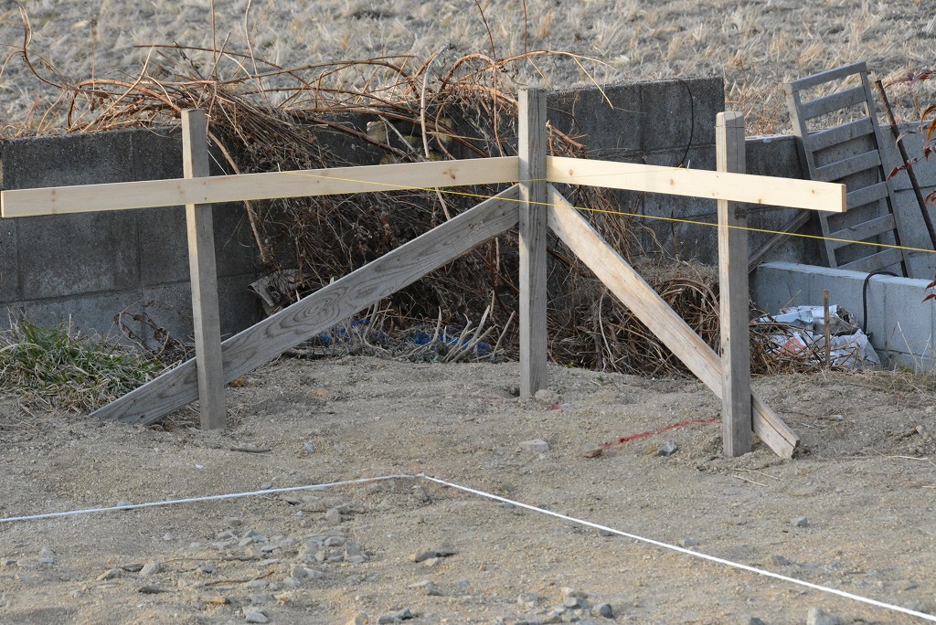 早速、基礎業者さんが入り、「水盛り・遣り方(建物の正確な位置出しと、レベル測定により