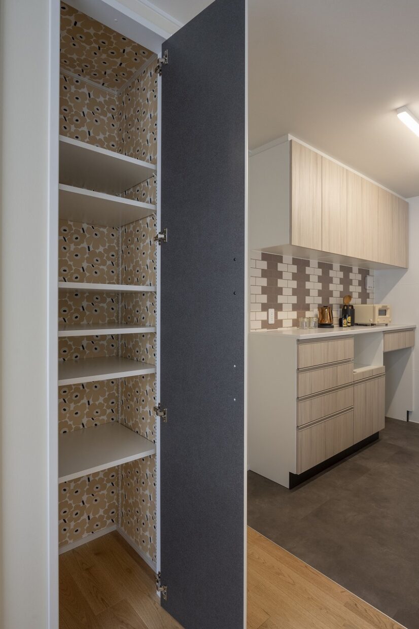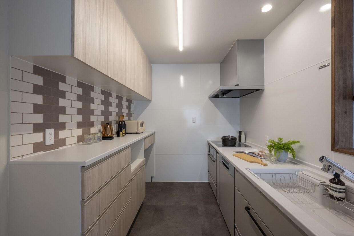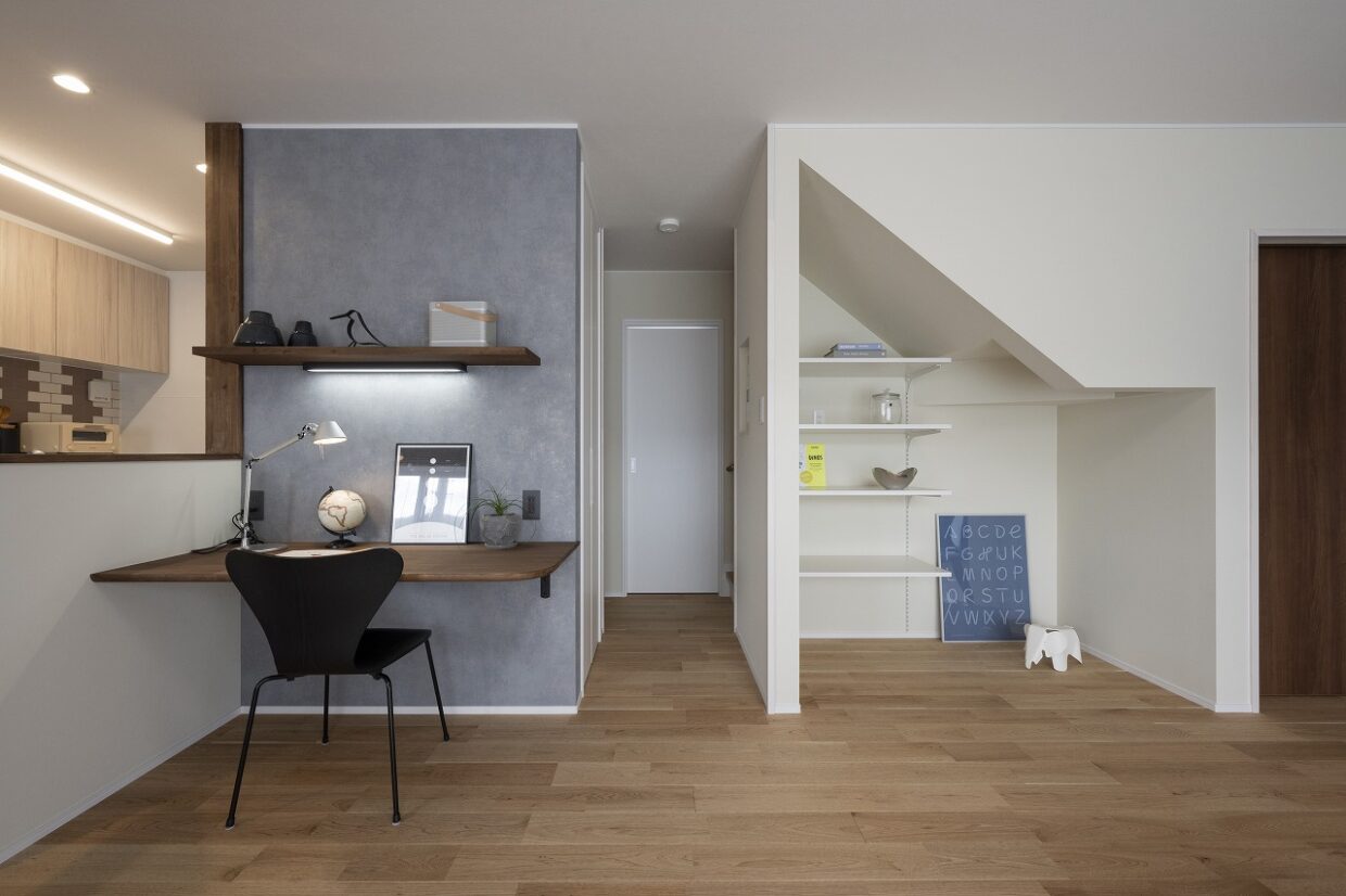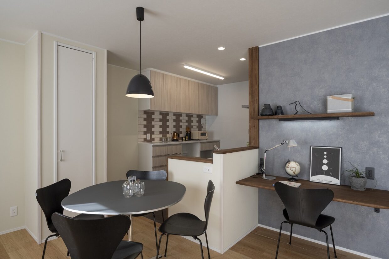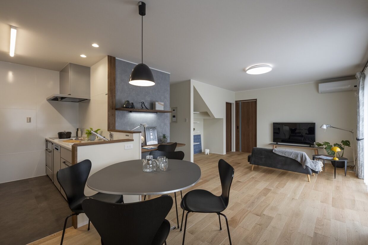 リビングからの視線に入るカップボードは木調、壁面は磁器タイルの装飾