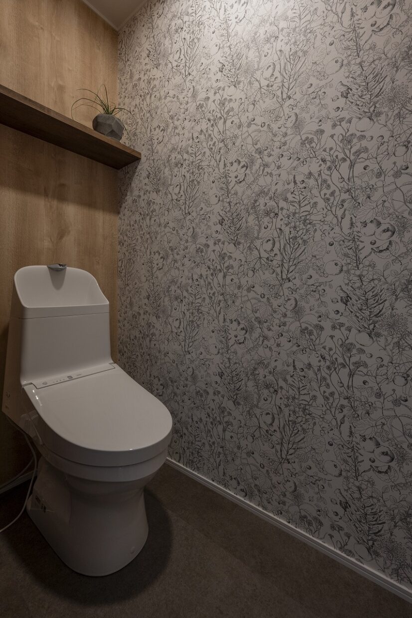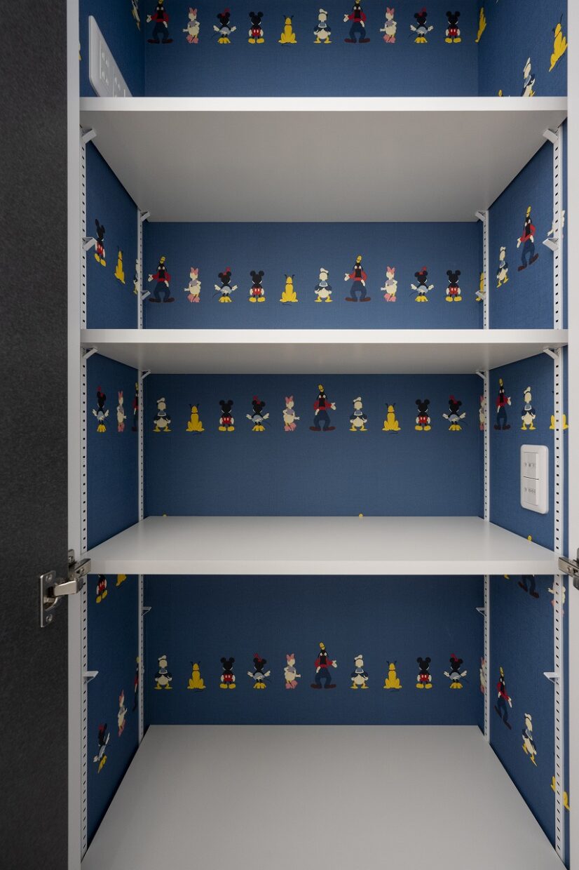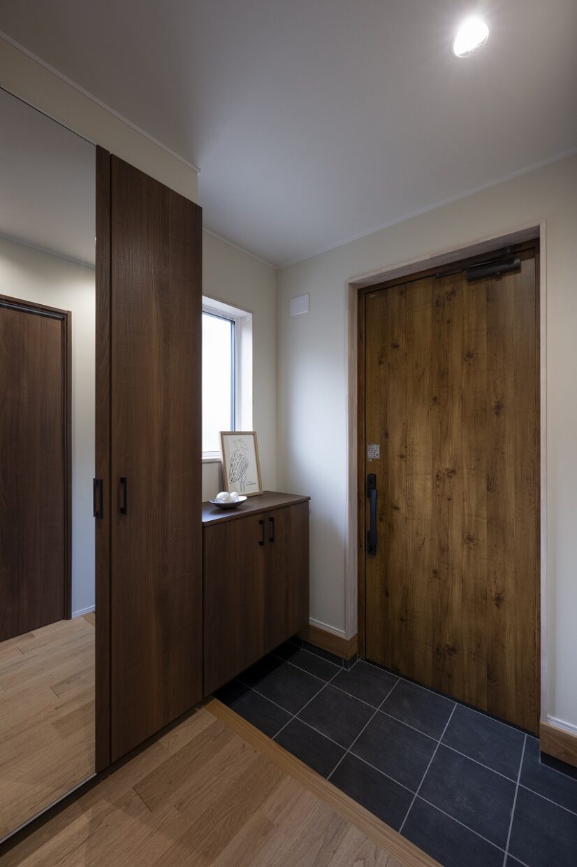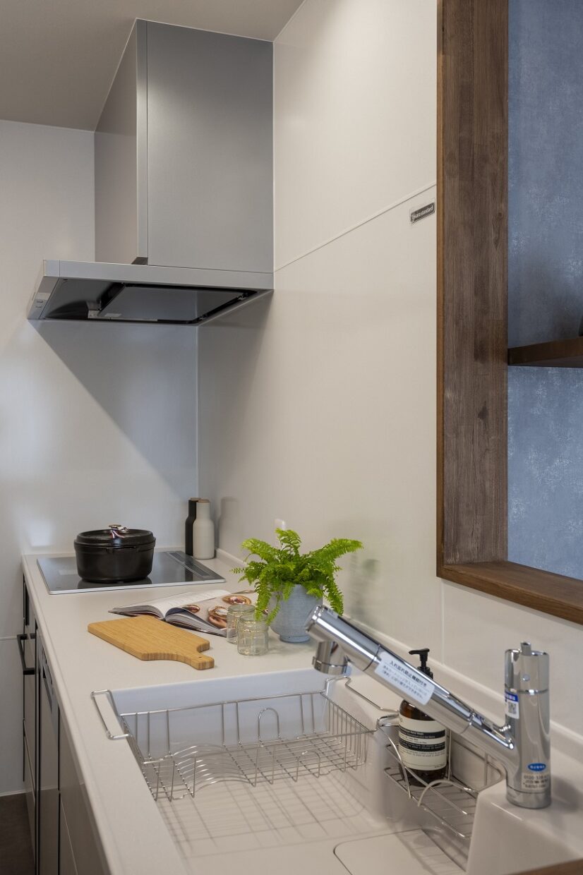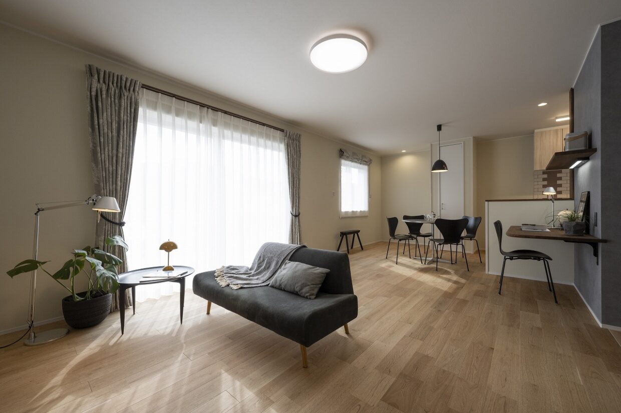 リビングからの視線に入るカップボードは木調、壁面は磁器タイルの装飾
